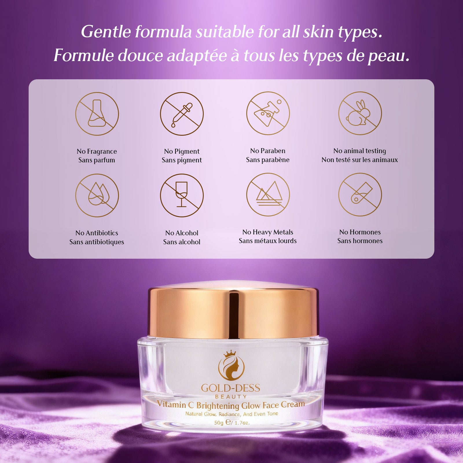 Discover the Gold-Dess Beauty Vitamin C Radiance & Hydration Face Cream, a luxurious daily moisturizer designed to deliver long-lasting hydration, brighten dull skin, and promote a smooth, even, and radiant complexion.